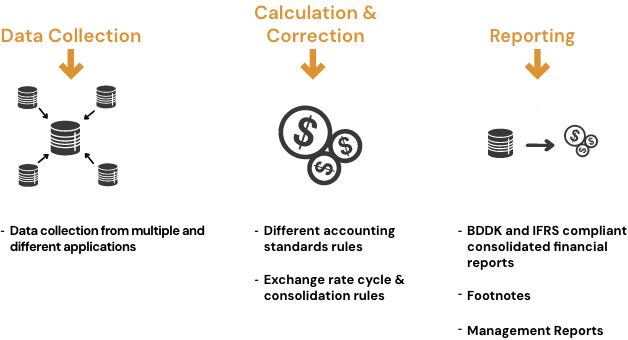 The contributions provided by Financial Consolidation products mainly consist of a combination of data collection, calculation, correction, and reporting steps.