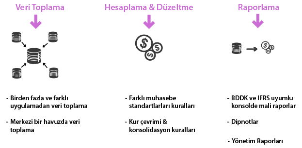 Finansal Konsolidasyon ürünlerinin sağladığı katkılar ana hatlarıyla veri toplama, hesaplama, düzeltme ve raporlama adımlarının birleşiminden oluşuyor.