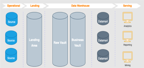 In this approach, the data is kept normalized again. It contains tables called Hub, Link, and Satellite, and the data filled into these tables are divided into transactional, dimensional, or relation tables.
