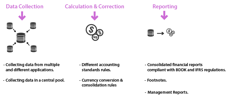 The contributions provided by Financial Consolidation products mainly consist of a combination of data collection, calculation, correction, and reporting steps.